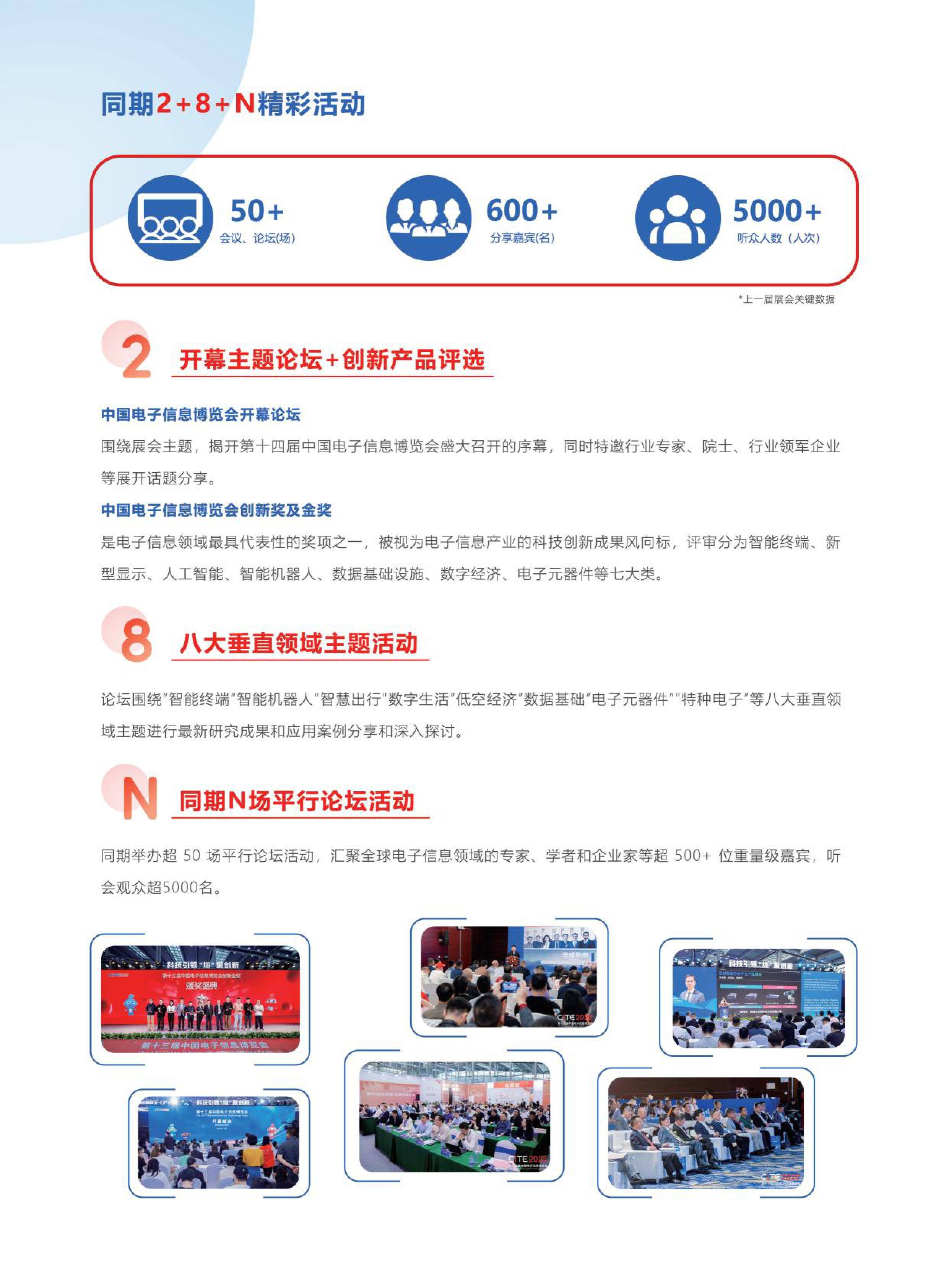 中国电子信息博览会(中文简称:电博会,英文简称:CITE)是中国规模较大、具有国际影响力的电子信息产业盛会之一。经过多年的发展,CITE电博会吸引了来自全球各地的参展商和观众,展示了中国电子信息产业的新成果和技术发展趋势。电博会以“全球视野,国际一流,创新引领,服务产业”为理念, 不仅为中国电子信息产业的国际交流和合作提供了重要平台,同时为产业链上下游协同创新提供了高效交流平台,促进电子信息产业与国民经济各领域进一步融合赋能,推动中国数字经济实现高质量发展。