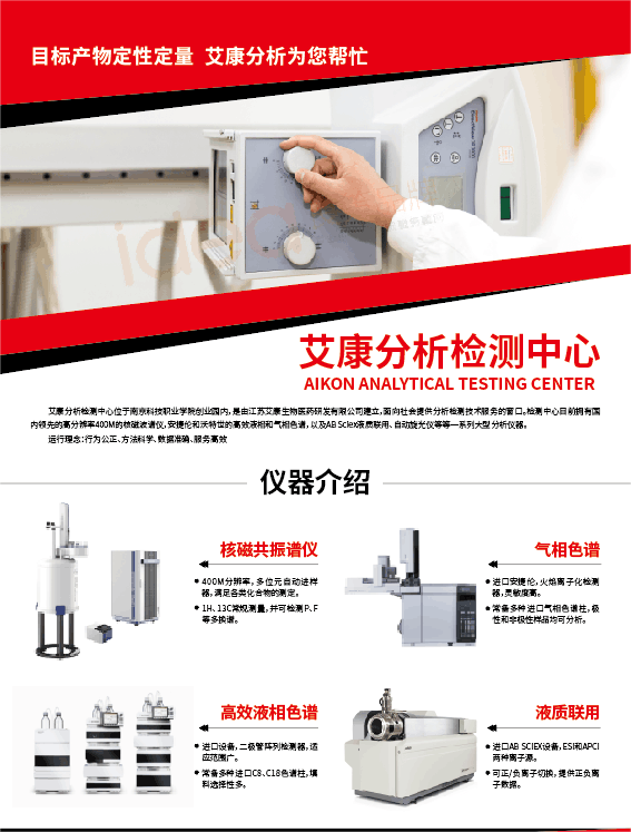 南京艾康分析检测中心位于南京市江北新区hua工园内,是由江苏艾康sheng物医yao研发有限公司建立,面向社会提供分析检测技术服务的窗口。成立以来检测中心不断的发展和完善,以符合行业标准的分析检测实验室,和“行为公正、方法科学、数据准确、服务高效”的运行理念,为社会各界提供专业高效的技术服务。