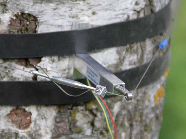 DC2是C1改进版本。钢丝绳的拉力改为径向设置。这样钢丝绳对树的压力和树径无关,不同树径的测量结果可直接比较。传感器通过一个由热膨胀系数最低的合金制成的钢丝绳固定在树上。用小塑料环减少钢丝绳对树的压力,并减少摩擦阻力,大大提高灵敏度。