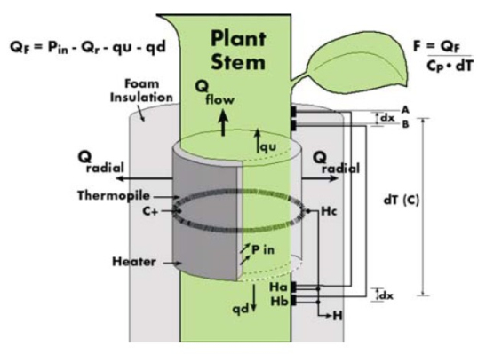 原理:能量平衡原理被科学证明和已有资料表明对绝大部分作物和许多树种有效。与其它方法对比包裹茎流探头无须标定,这是因为茎流通量是由能量平衡和茎流的热转化速度直接确定的。