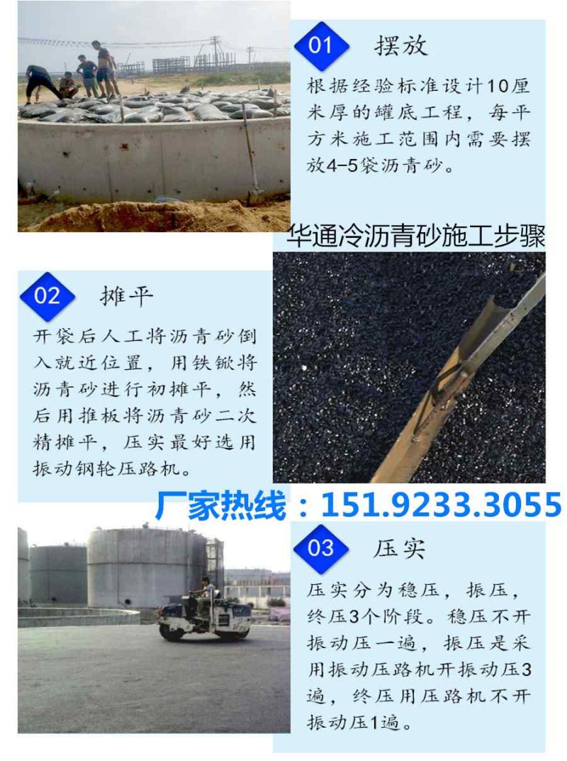 产品施工工艺十分简单,不需要专业人员,普通工人便可以轻松施工。罐底面层黄沙施工完毕后直接将华通冷沥青砂摊铺在上面便可,如铺筑5公分的沥青砂施工时在面层上每平方大约摆放4-5袋材料便可,材料摆好后用工具将包装打开将沥青砂倒出摊平,摊铺均匀后用工具压实便可,压实工具可以采用振动钢轮压路机等工具由外向内逐圈压实,这样压实完成后的沥青砂外圈不会出现松散的现象,需要注意的是沥青砂材料每次铺筑的厚度不能超过5里面,如高出5厘米需要分层压实,保证材料的压实密度。