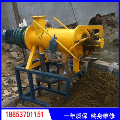 包括驱动设备、脱水室及湿度调节装置,脱水室呈圆筒状且其内部安装有螺旋轴,脱水室与螺旋轴同轴心安装,驱动设备的输出端与螺旋轴的一端连接并驱动所述螺旋轴作旋转运动,脱水室的一端上方设置有与脱水室相通的进料管道,进料管道上设置有控制进料流量的控制口,通过管道连接一提升泵,脱水室的另一端设置有排料口,排料口处设置有湿度调节装置,脱水室的底壁上设置有与脱水室相通的排液口,排液口处设置有过滤网,湿度调节装置包括锥形塞体、挤压弹簧以及挤压摇手,锥形塞体的中部设有供螺旋轴穿出的通孔,锥形塞体套接在螺旋轴上,螺旋轴穿过锥形塞体的通孔一端螺接有挤压摇手,挤压弹簧设置在锥形塞体与挤压摇手之间的螺旋轴上且挤压弹簧的两端分别与锥形塞体、挤压摇手相抵接,锥形塞体与脱水室的端口之间的环形间隙形成排料口。