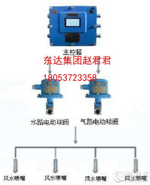 当放炮作业时,内置在主控箱的触、声控传感器同时动作时(为避免误动作,因而采取双控方式),动作信号送入主控箱,主控箱控制电动球阀开启(若接入高压风并安装风水喷头时,高压风也同时打开),进行洒水降尘(实现高压风水远程喷雾降尘);当触、声控传感器无动作信号时,延时设定的时间后停止喷雾;再次触发传感器动作时,进入下一个喷雾过程。