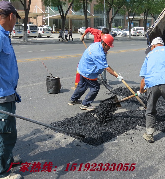 2. 然后将华通沥青冷补料直接倒进坑槽内,人工摊平,填料高度高处地面1.5厘米。