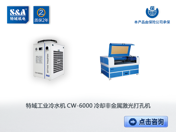 特域冷水机经过多年的发展已成为行业标杆,应用范围涵盖120多个行业。目前,特域S&A可供应0.6KW-30KW制冷量的工业冷水机,适用于国内外大部分成熟品牌CO2激光器的冷却。如400W的功率,可配非金属激光打孔机冷水机CW-6000。