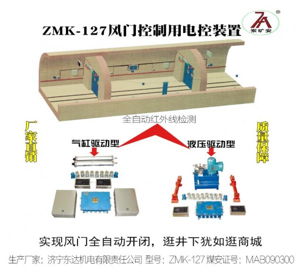 ZMK-127型电液全自动风门由两道单式风门主体, 一台电控箱、一台防爆液压站、两套声光报警显示器、两套红外线传感器、两套位置传感器、两套手动控制按钮组成,两条风门液压驱动油缸组成。