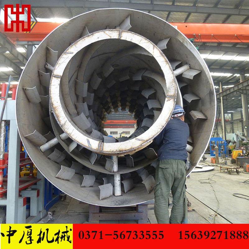 回转式烘干机内部结构(即抄板,亦称扬料板)形式是烘干机性能的主要关键。扬料板的作用是尽快将物料送向转筒的内部装置。内部装置的目的是保证烘干机转动时物料有剧烈的搅动和物料在转筒横截面上均匀发布,以及气体与湿物料的充分接触。物料在这些螺旋形导料板上发生预先干燥,特别是对黏性物料,能改善物料在内部装置上的发布情况。根据物料要求,中厚机械回转烘干机内部导料板可分为传统导料板,翻动式抄板、分配式以及新型的多管式扬料板、活动物料扬料器、齿形扬料板、链条式打散系统等近百种内部装置。
