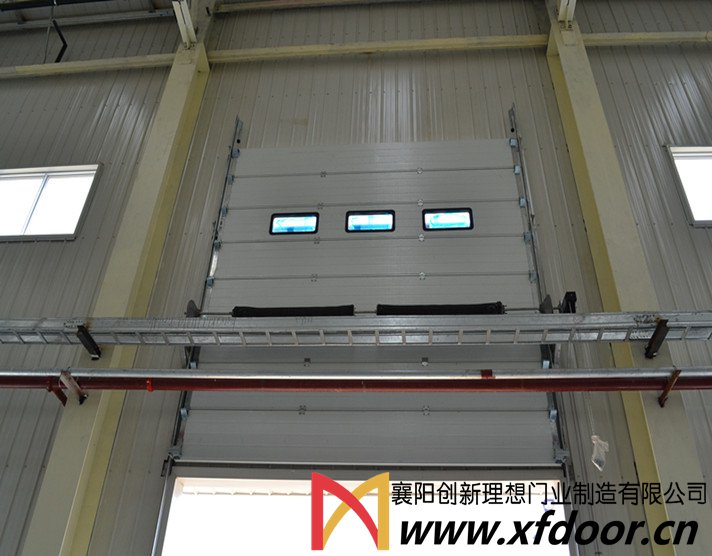 运行原理:门板以铰链衔接,固定在导轨滑道内,电机带动钢丝绳提升门体。