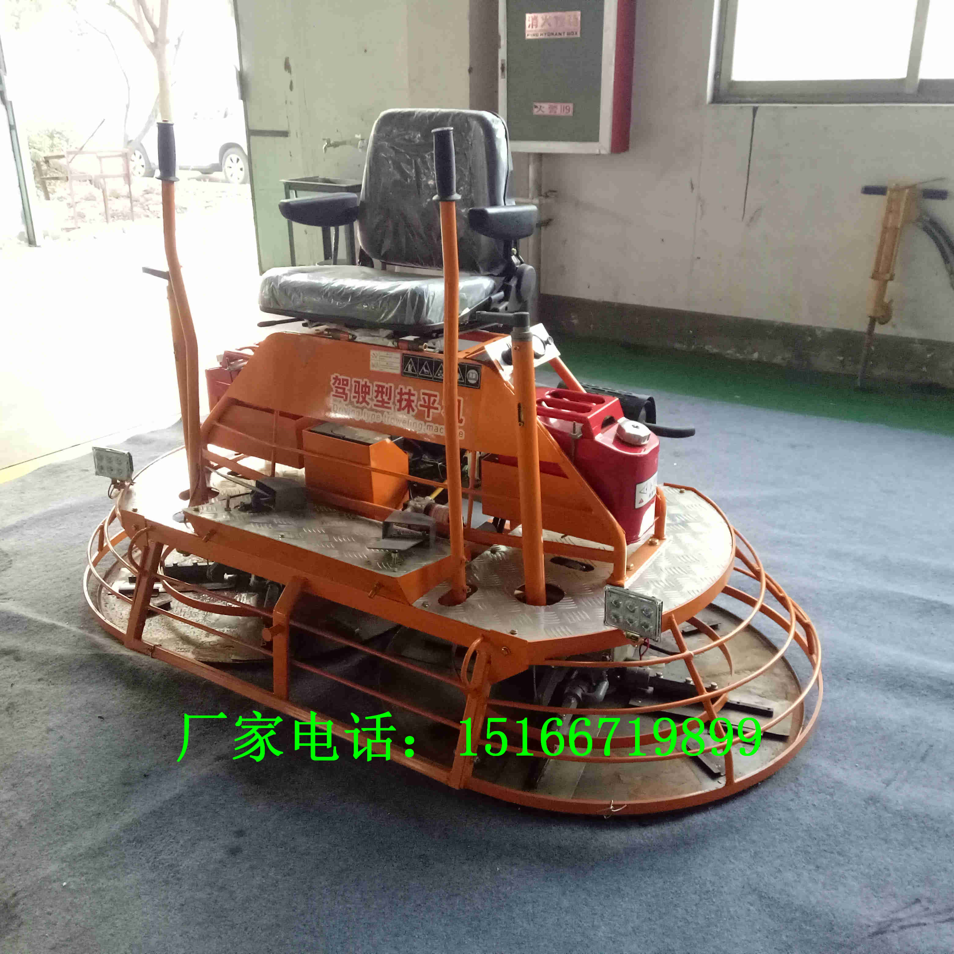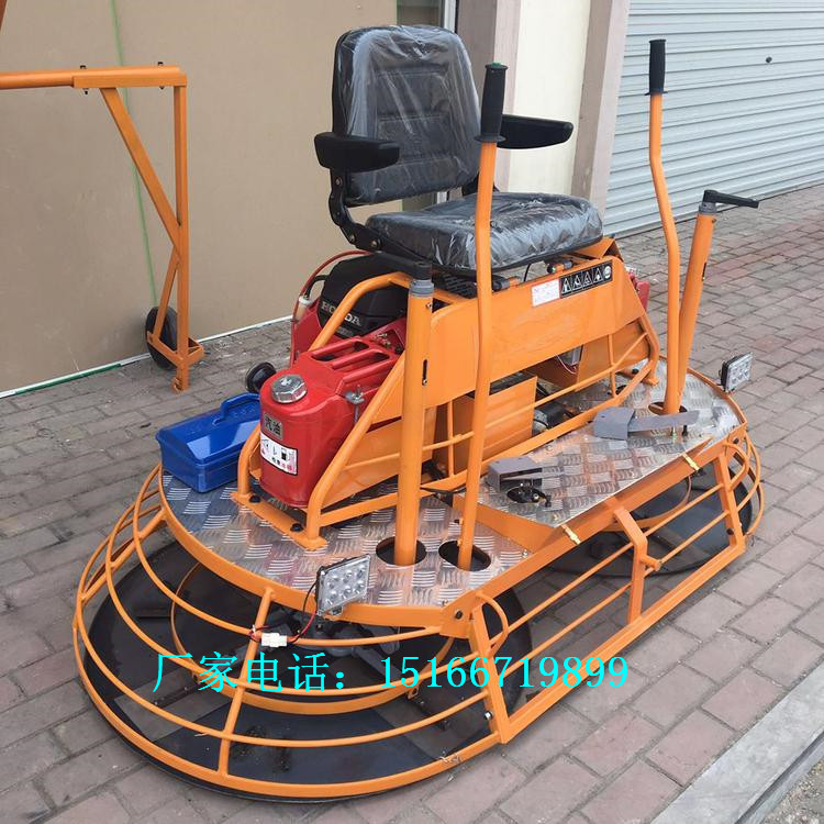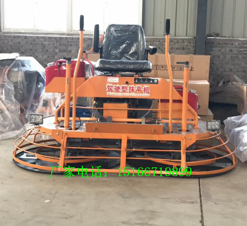 山东金尊机械倾情打造 座驾式混凝土抹光机 ,不断升级,目前这款金尊新式双盘抹光机,加大了减速机,四叶抹光机采用直联涡轮减速机传递动力,具有减速比大、效率更高。本机结构为:电动、汽油机经三角皮带传动涡轮箱,从而带动抹片旋转而达到抹平。涡轮传动具有传动扭矩大、耐用、平稳、转速均匀等优点。整机结构更为紧凑,使用起来感觉会更省力,人连续工作好几个小时也不会觉得疲劳。劳动强度降低了效率就上去了,明显高于手扶抺平机。双刀盘结构,重量大,对地面具有更好的压实效果,有利用地面提浆抹平。