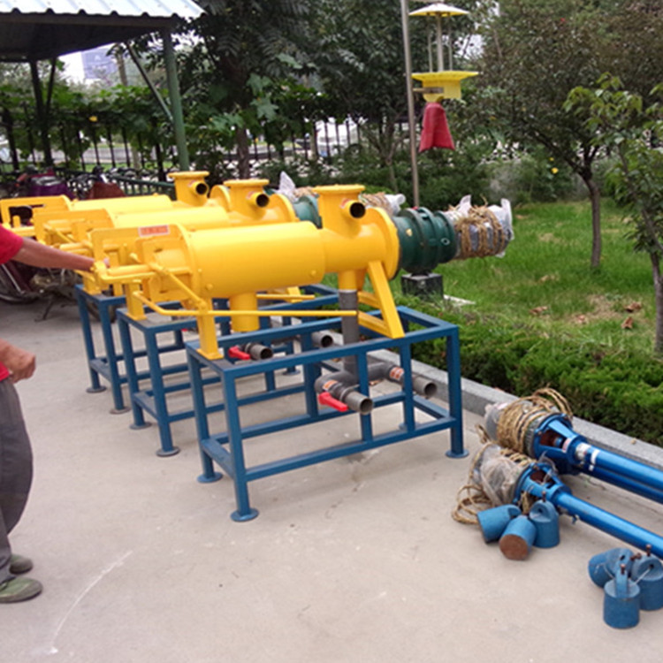 该机分离流程如下:粪便污水首先经过管道或者渠集中到集粪中,由液下泵将牛粪污水提升送至固液分离机内,挤压绞龙将粪便污水逐渐推向机体前方,同时不断提高前缘的压力,迫使物料中的水分在边压带滤的作用下挤出网筛,流出排水管。固液分离机的工作是连续的,其物料不断的提升至机体内,前缘的压力不断增大,当大到一定程度时,就将卸料口顶开,挤出挤压口,达到挤压出料的目的。如果抽入的粪便水过多也会经溢液管排到原集粪池中也起到了搅拌的作用,经螺旋挤压过滤分离出的废水可直接派送至沉淀池等。为了掌握出料的速度与含水量,可以调节主机下方的配重块,以达到满意适当的出料状态。