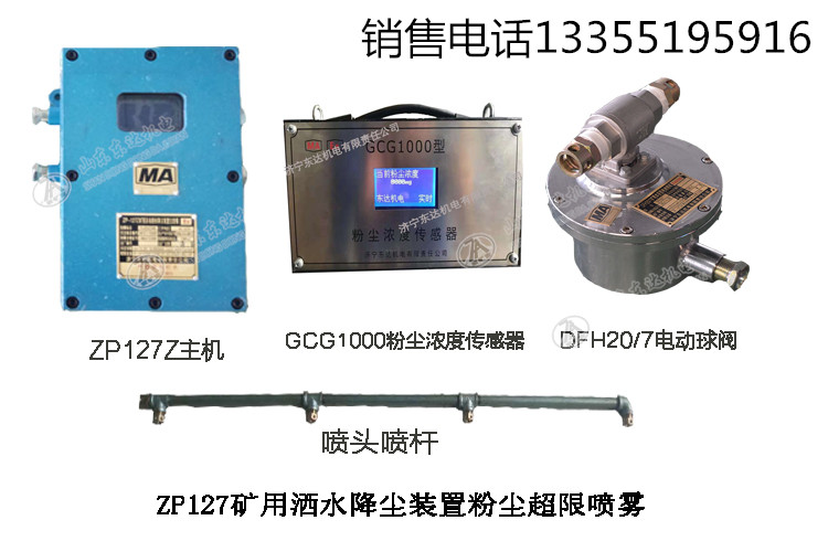 ZP127粉尘超限洒水水幕配置:洒水主控箱1台,本安电动球阀1台,热释光控传感器2台,粉尘浓度传感器1台,加上其他附件比如喷头喷管,U型卡,10个的高压胶管,水质过滤器