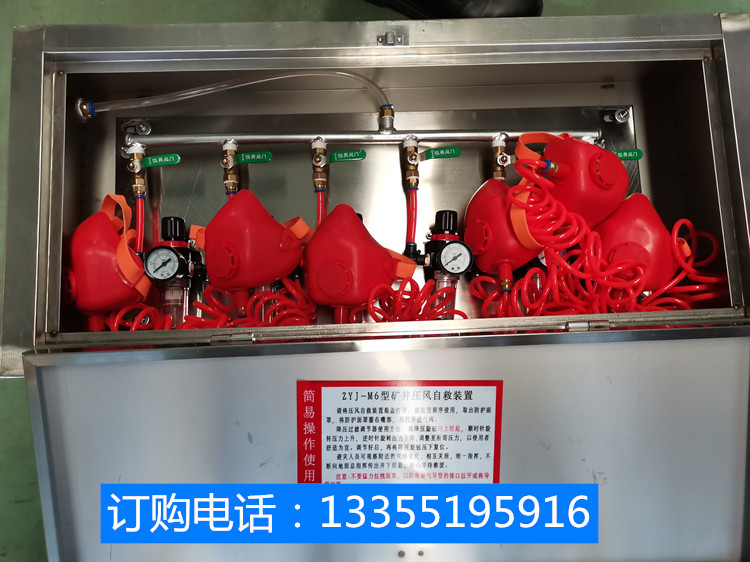 ZYJ-M6型矿井压风(供水)自救装置,本装置一箱六组(可根据要求设计组别),能同时提供六人使用,达到互相照顾的效果。该装置由箱体、安装板、进气管、进水管、净水过滤器、门锁、呼吸器(多组)、排水装置(多组)等组成。箱体、安装板、总进气管、总进水管采用不锈钢制造而成。