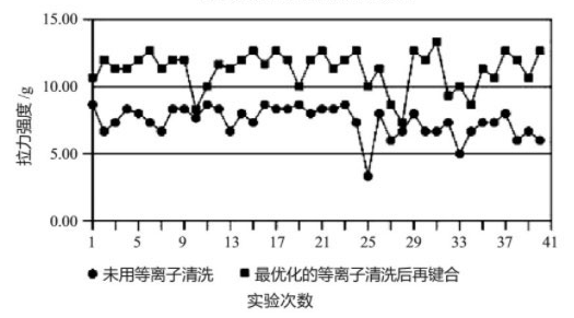从使用和未使用离子清洗的拉力强度对比, 使用离子清洗后键合引线拉力强度有明显增加