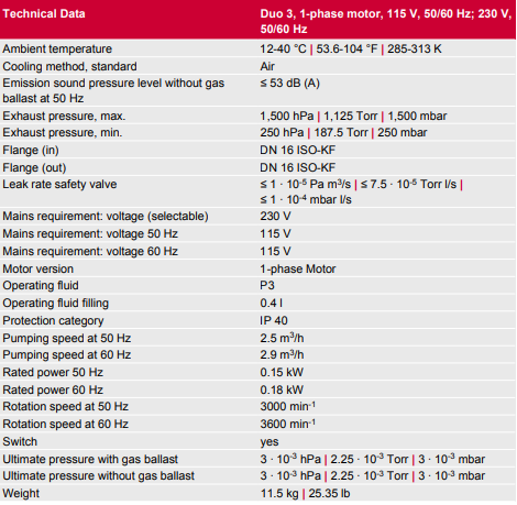 伯东 Pfeiffer 旋片泵 Duo 3 技术参数如下: