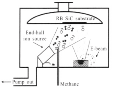 某国内精密光学制造商为了进一步提高碳化硅反射镜基底表面光学质量, 满足高质量空间光学系统的应用需求, 采用电子枪蒸发纯硅, KRI 霍尔离子源喷出的氢离子电离甲烷, 并以离子辅助沉积的方法在反应烧结碳化硅基底上镀制了表面改性用碳化硅薄膜, 并对改性膜层进行了光学抛光处理.