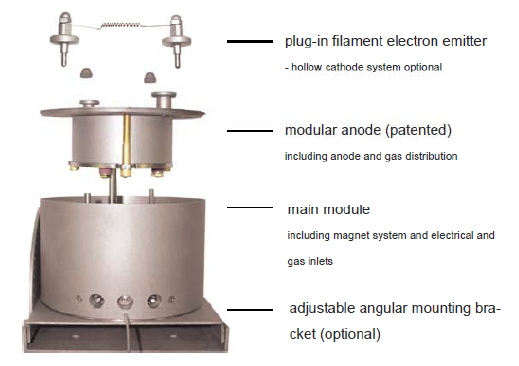 考夫曼离子源 KDC属于高浓度低动能型, 其主要构成结构有: