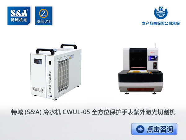 这种加工方式就是紫外激光切割机。紫外激光器其波长为355nm,由于其不直接接触手表配件,且热影响区极少,因此其加工方式被称为"冷加工"。这是十分有利于像手表那样的精加工。可紫外激光器在工作过程中也会产生多余热量,需要及时带走,不然会影响紫外激光器的正常运作。而特域(S&A)激光冷水机CWUL-05则能有效带走紫外激光器的多余热量。