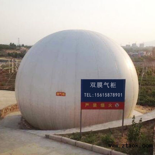 沼气储气柜原理:底膜、内膜、外膜共同形成两个空间。内膜空间作为储气空间储存各种气体,外膜与内膜夹层的空间作为调压空间。当储存的气体增加时内膜曲张,控制设备排出外膜的调压空气腾出一定的容量。当内膜储存的气体较少时控制设备向调压层注入空气,平衡柜内的压强,稳定外膜刚度。(即用一个软体球形作为储气柜,储存的气体容积变少控制设备就自动充空气填补,储存气体增多安全保护器就释放空气以平衡压力。为不让气体混合,储存的气体与空气之间使用内膜隔离开)