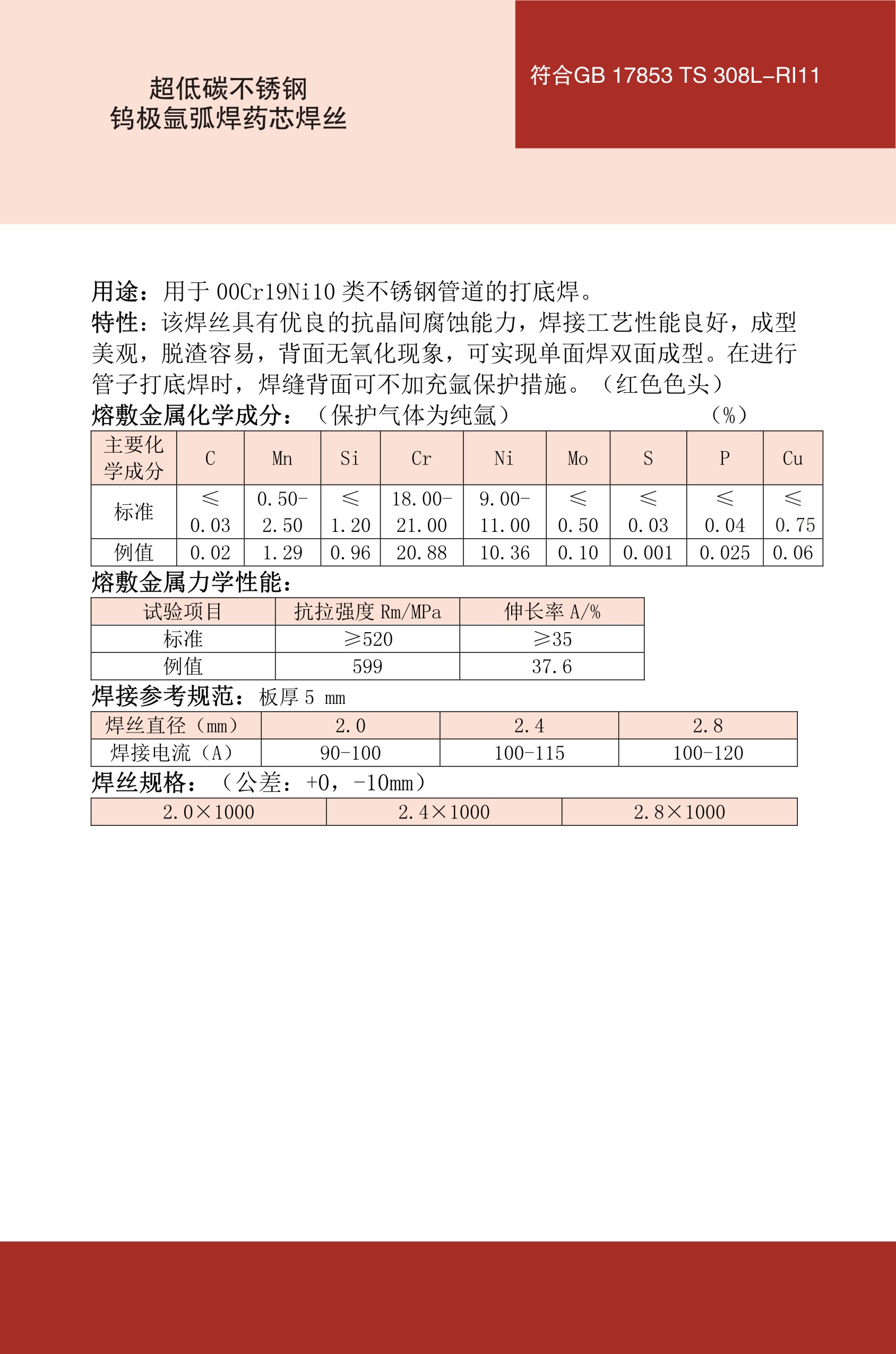 THY-A308L(W)不锈钢钨极氩弧焊药芯焊丝