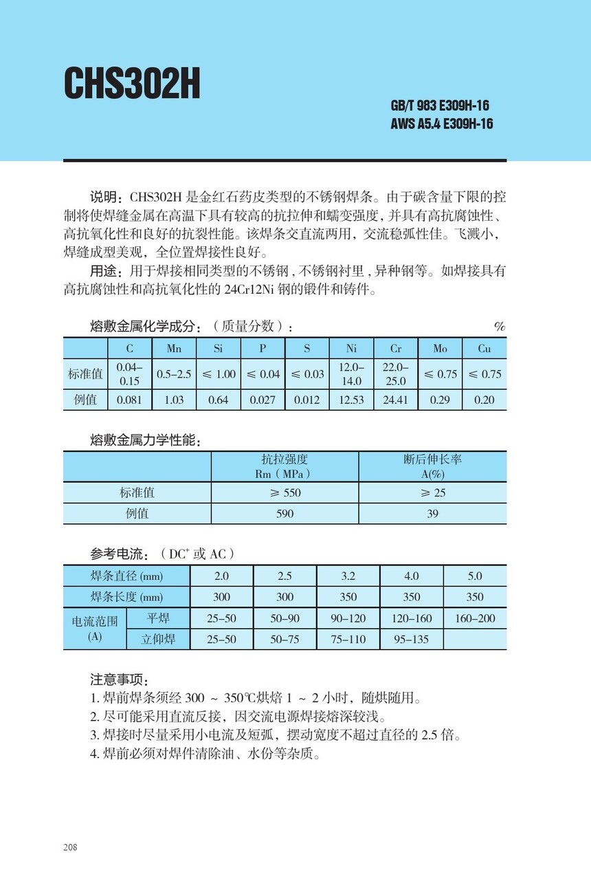 CHS302H不锈钢焊条E309H-16焊条