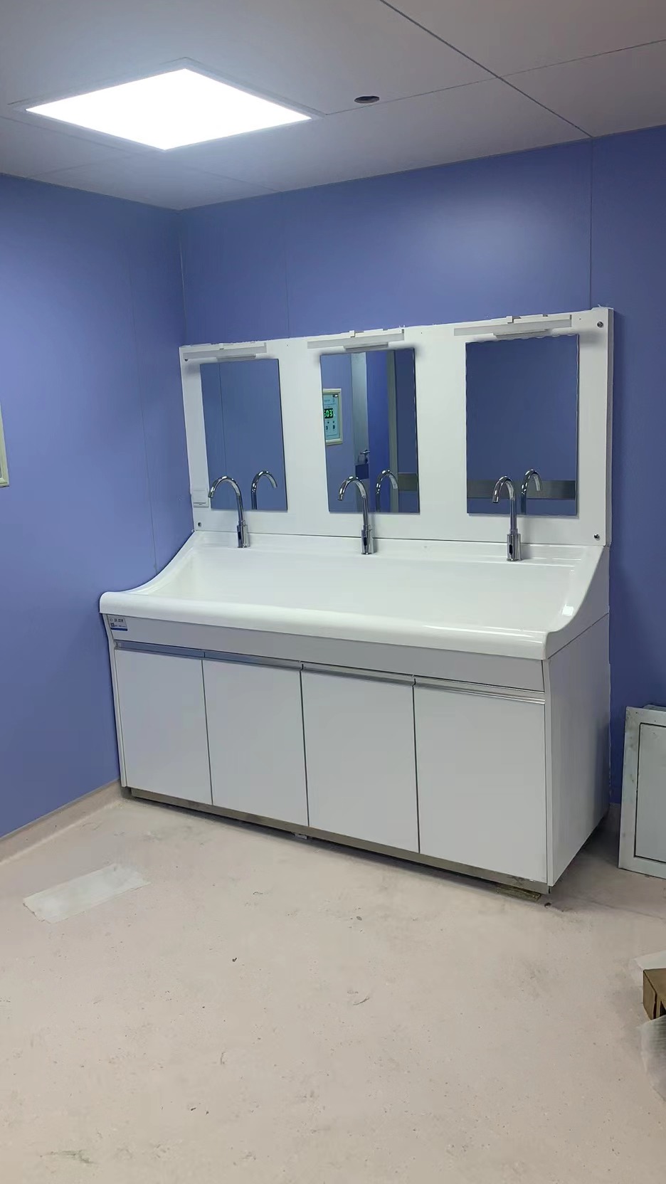 高分子洗手池材质特点:采用高分子材料一次吸塑成型,出水方式有:感应式、膝控式、脚踏式和手动开关,一台洗手池可客户要求选择单一出水方式或多种出水方式。洗手池分高背和低背,高背总高度1800mm,配有美容镜,照明灯,皂液器,可按客户要求配置烘手器和热水器。低背板无配置。
