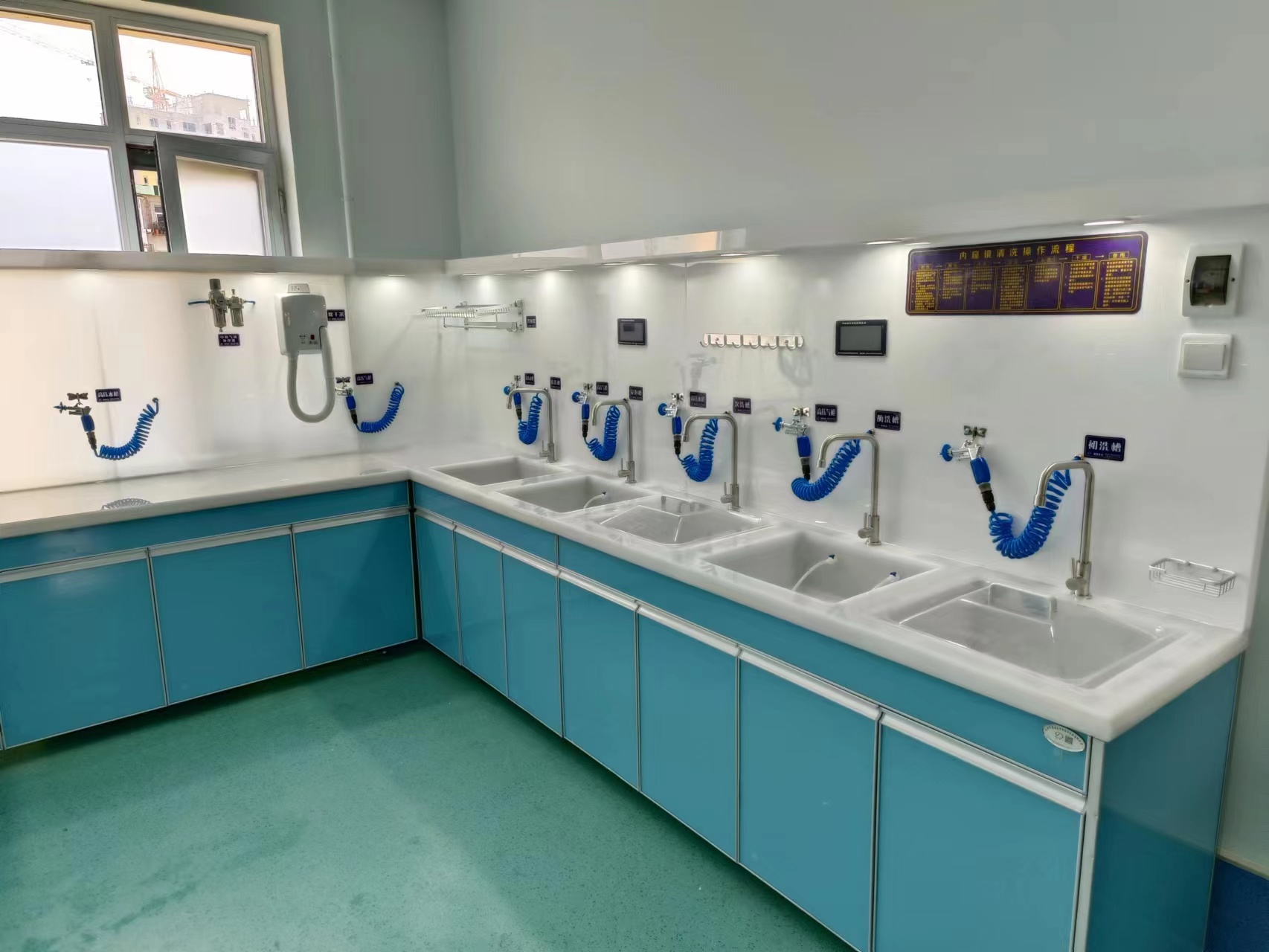 有机玻璃内窥镜清洗工作站产品特点:本产品采用高档有机玻璃材质制成,具有耐腐蚀、抗冲击力、对内窥镜无损伤等特点;产品主要采用微电脑控制系统,配备五槽清洗槽、高压水枪、高压气枪、水处理系统、气处理系统、干燥台、节液(酶)系统、给排水系统、照明系统及其他辅助设备。