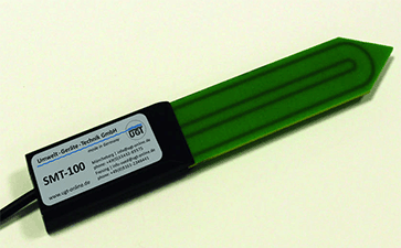 SMT-100土壤水分温度传感器结合了FDR传感器的低成本与TDR传感器的高精度。SMT-100可以像TDR传感器一样通过测量信号传递时间来确定土壤的介电常数;也可以像FDR传感器一样通过电磁波频率的变化来确认土壤的介电常数。与FDR传感器不同的是,SMT-100不是基于电容器,而是采用环形振荡器来测量信号传递时间以及电磁频率的变换,而传感器产生的频率(>100 MHz)可以支持传感器在粘性土壤中测量。传感器材料是PCB板,主题紧凑坚实,能防霜冻。前端有尖头,能直接插进土壤,适合于长期野外监测。传感器和线缆都是密封防水的,可以多种信号输出。