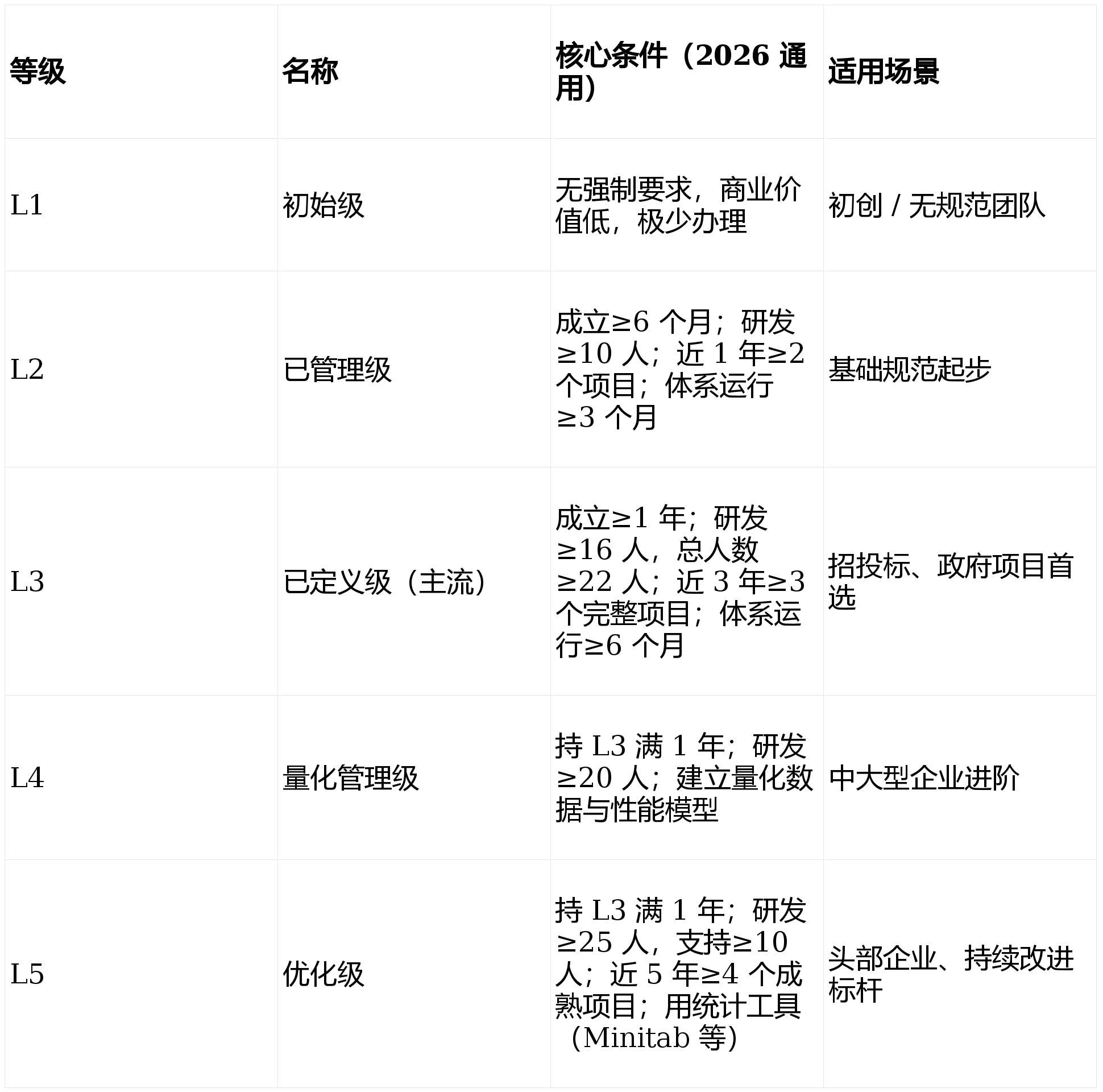 CMMI(能力成熟度模型集成)是国际通用的软件与系统工程过程能力成熟度评估标准,核心用于衡量企业研发管理、过程改进与交付能力,广泛用于招投标、政府项目、军工 / 信创等场景。以下为 2026 年最新实操指南,含等级、条件、流程、费用、周期与维护要点。