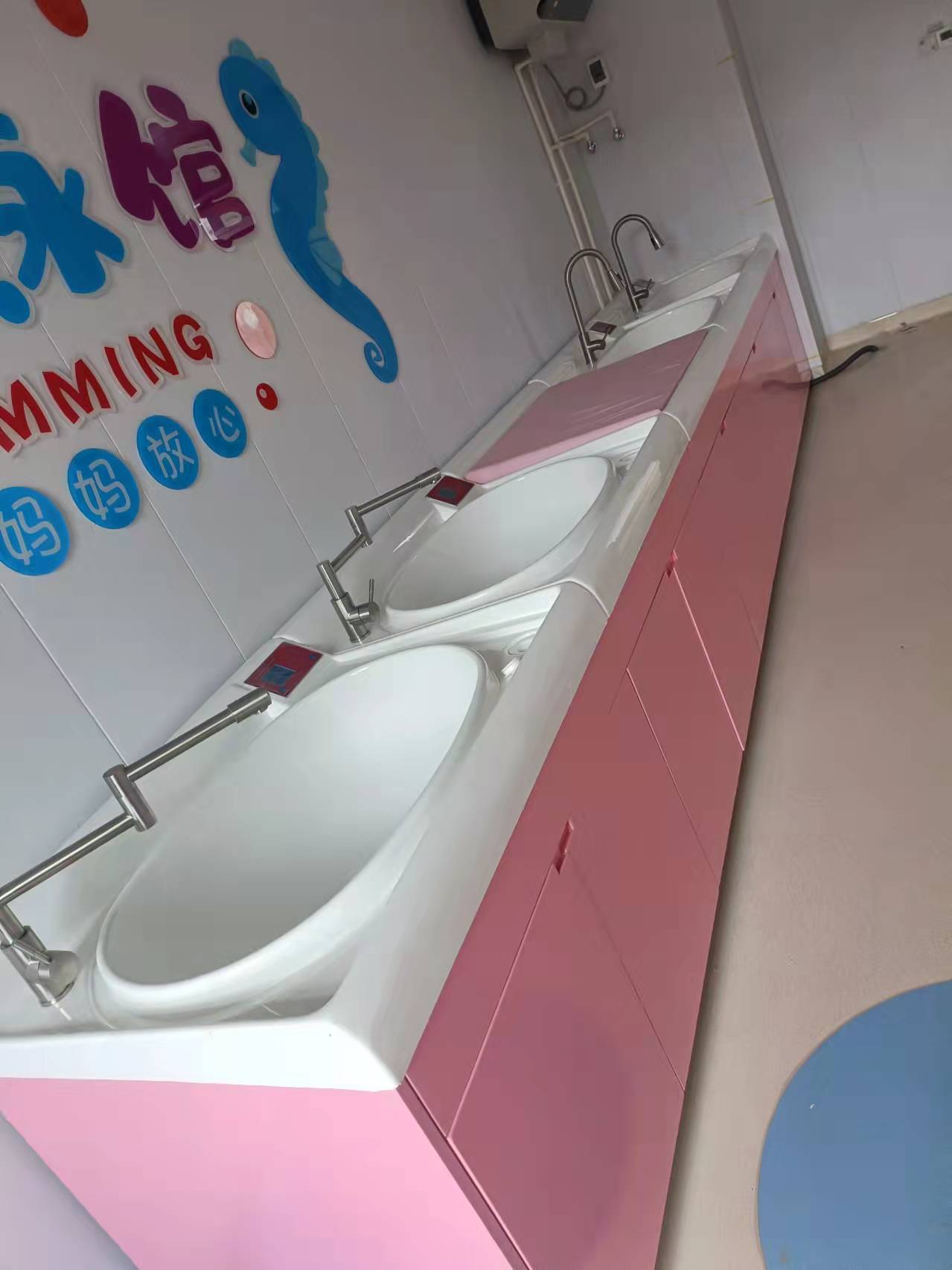 婴儿洗浴中心拥有良好的台面质感,细腻亲切,无冰冷感,全弧形造型设计给婴儿体贴的呵护与关怀,洗礼池和游泳池特有的裙边设计,既方便固定一次性防交叉感染隔膜袋,又防止台面上污水流入池内。游泳池利用有效的水平面积提供更加理想的池内净深度,满足婴幼儿洗浴时的安全高度需要,同时有效保持水温特别设置水位线,防止婴儿游泳时池水外溢。