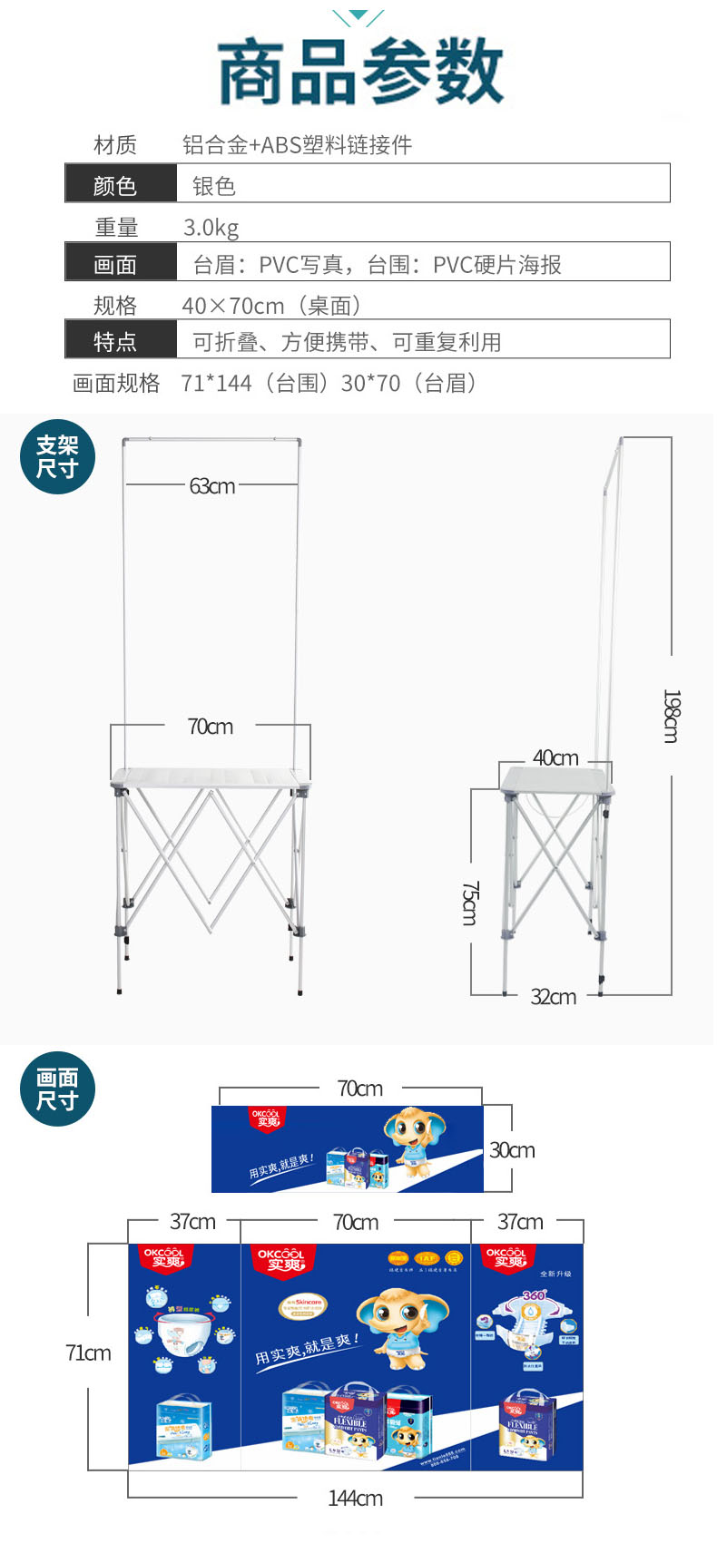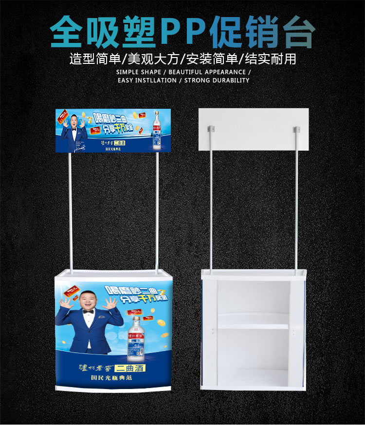 产品说明:此促销台为新开发产品,桌面和架体全部为铝合金材质,外表美观,承重40公斤,收起来等同于易拉宝的大小