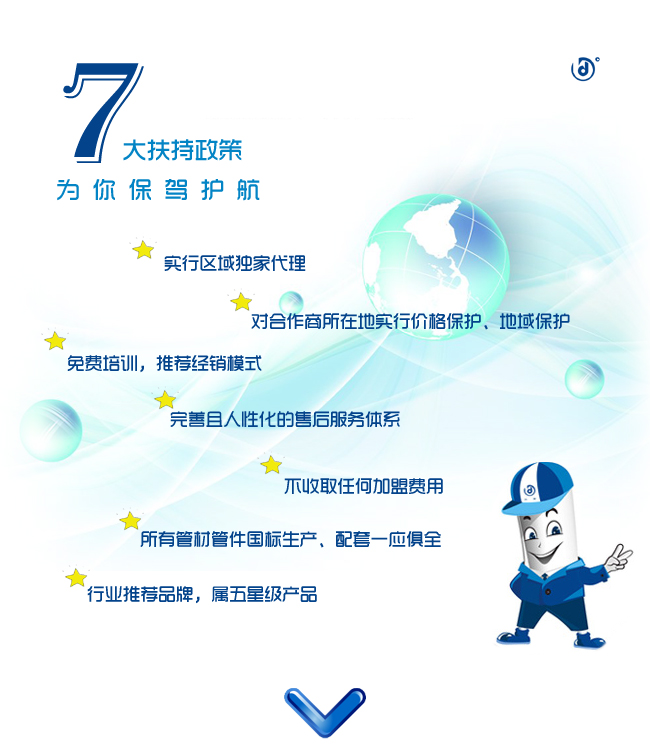 5不收取任何加盟费用 6所有管材管件国标生产、配套一应俱全