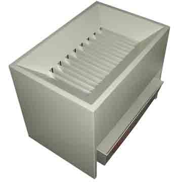 横格式分样器构造简单实用,凹槽排列成一直行。用来对分各种种子,当把种子从上面倒入到仪器,通过一系列交叉的相反方向的滑道把样品分成相等的两份。