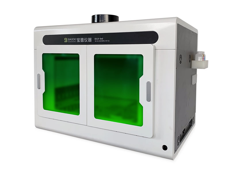 BUI-60全自动尿碘分析仪完全根据国家卫生行业标准方法WS/T 107-2016《尿碘中的砷铈催化分光光度法》设计,专用于全自动检测尿样中的碘含量。仪器包括高速高精度智能机械手、高精度恒温消解装置、超级循环式恒温水浴及低噪声高灵敏度检测系统,实现从自动加过硫酸铵、亚砷酸、硫酸铈铵溶液,自动无接触式涡旋搅拌、根据浓度高低自动转换检测波长、自动定时顺序比色检测、自动清洗等从样品前处理到检测报告输出的全部过程,无需人员值守,长期稳定性好,检测结果不受环境温度变化的影响。