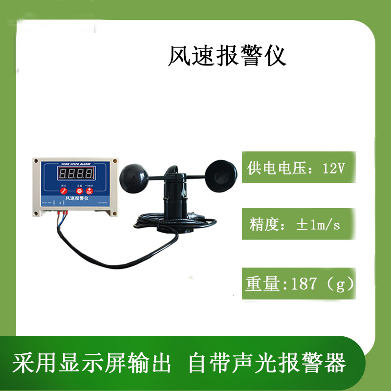 风速报警仪由微处理器和高动态特性的测风传感器组成,可观测大气中的瞬时风速和平均风速,具有风速报警设定和报警输出控制功能;风速报警仪采用显示屏输出,风速显示采用高亮LED数码管显示,观察距离远,并适合于光线较暗和夜间使用;风速报警仪自带声光报警器,风速超限时报警器发出声光报警,提醒操作人员注意安全,同时产生一路继电器开关量输出。