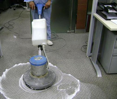 5、干泡刷洗:用装有打泡器、地毯刷的单盘扫地机,以干泡刷洗地毯。等清洁剂对地毯产生作用一会后,在重复刷洗工作。