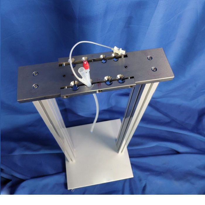 导尿管分离力试验装置主要技术参数: 1、满足YY0325-2016标准附录B 2、悬挂装置 3、连接装置与砝码总重量为1kg,连接装置与砝码总重量为0.7kg 4、试验连接器:刚性材料、环形标记、公称锥度20%。