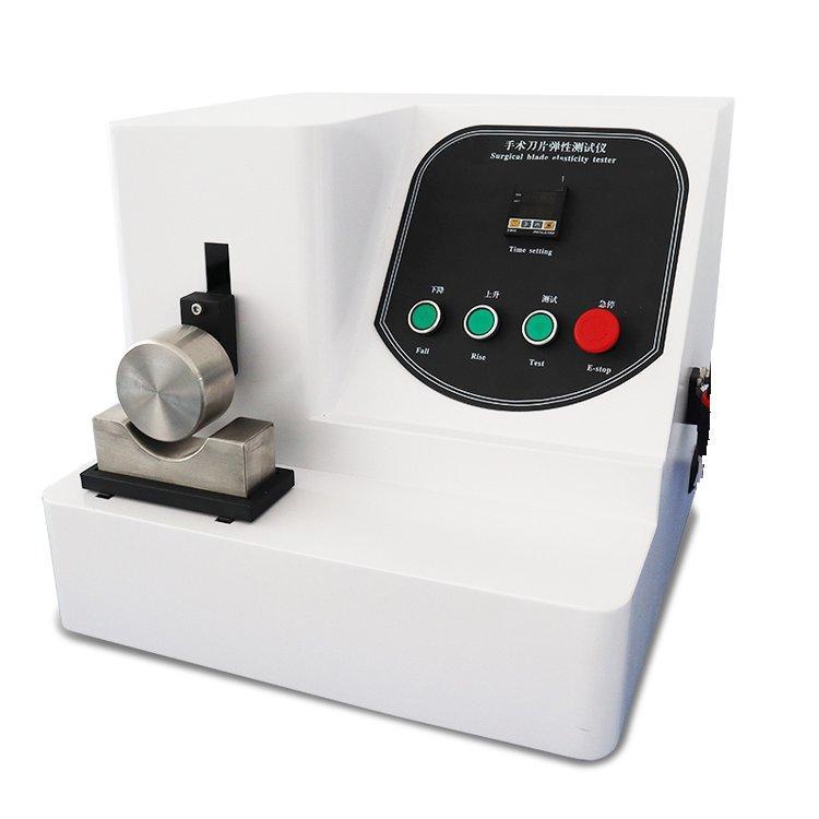 刀片弹性测试仪是国家检验生产厂家产品性能的高效检测设备。手术刀片弹性测试仪主要用于测定医用手术刀片弹性的物理特性,是鉴定医用手术刀片的重要手段之一。由可编程控制器、液晶显示屏、步进电机控制的传动机构、百分表显示的实测距离打印机等组成,可设定规格,下行距离。在屏上显示下行距离,试验时间,变形量,并可由打印机打印出试验数据。