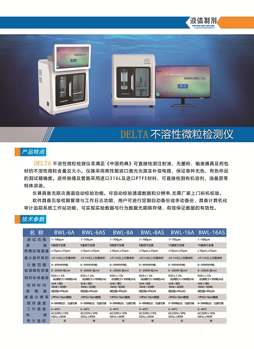 智能型不溶性微粒检测仪满足2020版《中国药典》可直接检测注射液、无菌粉、麻醉包、输液器具及一次性血路等产品的微粒含量及大小,符合 GB8368-2018的检测标准。适用于对溶液型注射液、注射用无菌粉末、注射用浓溶液、供静脉注射用无菌原料药、滴眼液、疫苗、注射用水、医药包材、输液器具等的大小及数量检测;输液终端过滤器滤除效果及其他微粒污染滤除率检测等;液体颗粒度、清洁度和污染物监测和分析。